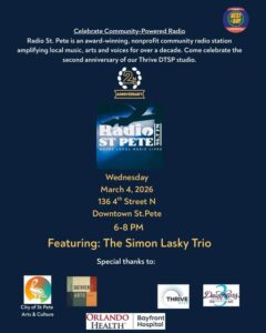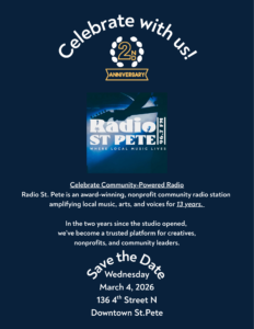 We bring you the music, stories, and voices of St. Pete 24/7—free to everyone, everywhere. It’s your support that keeps us on air and online. Even $5 a month makes all the difference in keeping local radio alive. Help RadioStPete continue to connect, inspire, and shine for our community. Donate here.